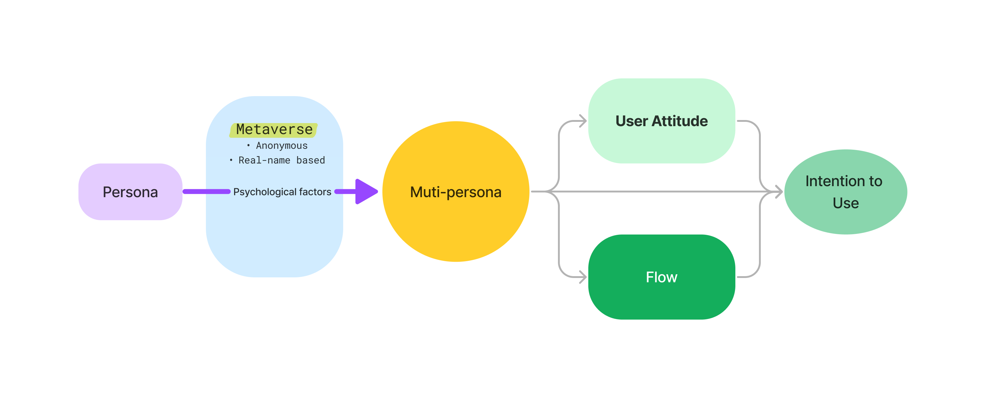 However, still unknown mechanisms remain (i.e. Multi-persona → Attitude, Flow, ITU)