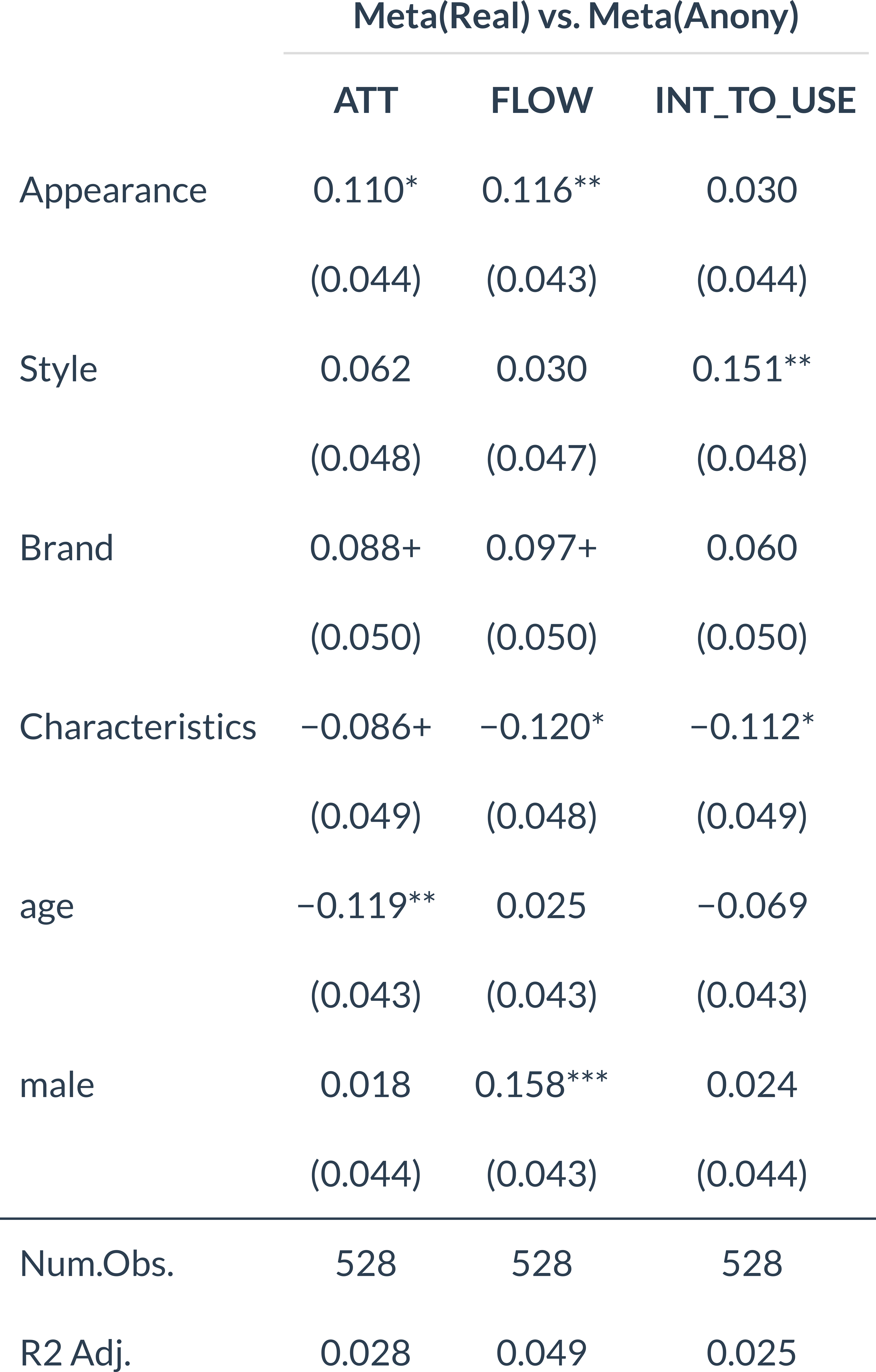 Multi-persona in avatar style: A more Casual style is associated with a lower likelihood of Continued usage (-) in anonymous metaverses (Exp 1. Real vs. Meta_a).